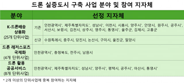 드론 실증도시 사업에 선정된 30개 지자체는 ▲K-드론배송 상용화 ▲드론 레저스포츠 국제화 드론 활용 공공서비스 사업을 진행한다.