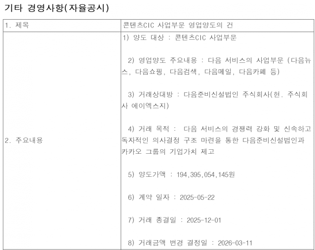 12일 금융감독원 전자공시시스템에 따르면 카카오는 전날 AXZ(전 다음준비신설법인)의 양도가액을 당초 70억원에서 약 1944억원으로 변경했다. 이는 지난해 11월 공시한 순자산가액이 상이한 경우 양수도대금을 조정하기로 결정한 데 따른 것이다.