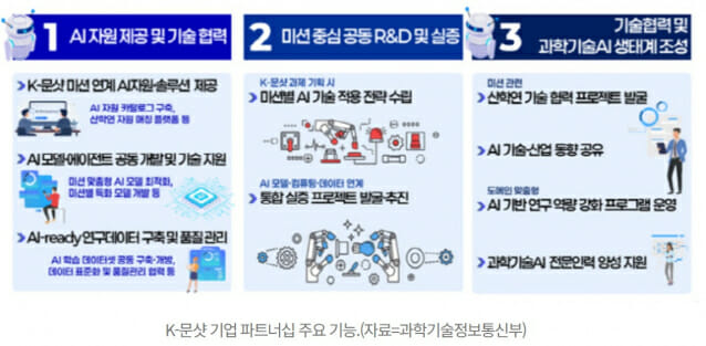 본격적인 전략 추진을 위해 과학기술정보통신부와 협력기업간 업무협약식이 11일 열렸고, 이 행사에는 배경훈 부총리 겸 과학기술정보통신부 장관을 비롯해 주요 정부출연연구기관 원장과 AI·인프라 및 8대 미션 관련 33곳 주요 기업 대표 등 50여 명이 참석했다. 이날 공식 출범한 ‘K-문샷 기업 파트너십’은 인공지능을 기반으로 과학기술 혁신을 촉진하고 국가적 난제 해결을 가속화하기 위한 민·관 협력 플랫폼으로, AI 인프라 기업 간 협력과 연계를 담당하는 중심적 역할을 수행한다.