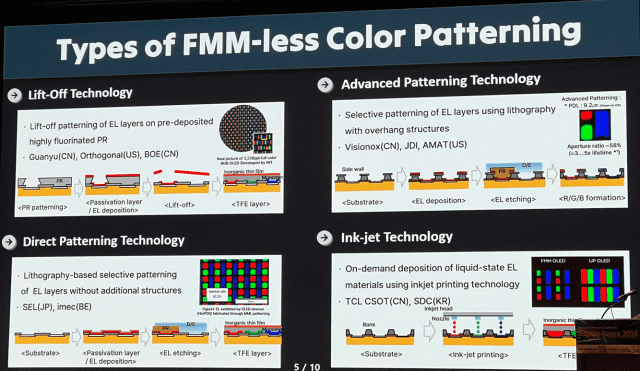 소병수 상무가 소개한 비-FMM OLED는 발광재료 증착 후 노광 공정으로 RGB 서브픽셀을 패터닝하는 이른바 'e립'(eLEAP, 일본 JDI 기술명), 그리고 RGB 서브픽셀을 잉크로 만들어 떨어뜨리는 잉크젯 프린팅 OLED 등을 가리킨다. 모두 차세대 RGB OLED 기술로 주목받고 있다.