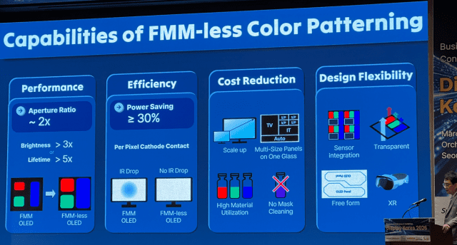 소 상무는 "FMM 방식 OLED는 개구율이 30%에 그친다"며 "비-FMM 방식은 개구율을 2배로 높일 수 있다"고 밝혔다. 개구율은 전체 화소 면적에서 RGB 서브픽셀 면적이 차지하는 비중을 말한다. FMM 방식 OLED는 FMM 두께와, 중앙이 처지는 문제 등으로 발광재료가 엉뚱한 위치에 달라붙는 섀도 현상(shadow effect)이 발생한다. FMM 대신 노광 공정으로 RGB 서브픽셀을 패터닝하면 섀도 효과를 줄일 수 있다.