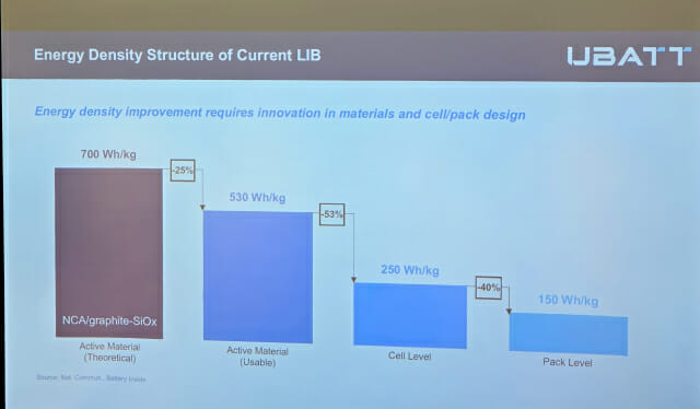 최 CTO는 “이론상 삼원계 리튬이온배터리가 구현 가능한 에너지 밀도는 700Wh/kg 수준이지만, 실제 구현 가능한 수준은 약 25% 감소한 530Wh/kg, 배터리셀 단위로 구현하면 여기서 50% 감소한 250Wh/kg, 배터리팩으로 구현하면 150Wh/kg 수준까지 내려간다”고 설명했다.