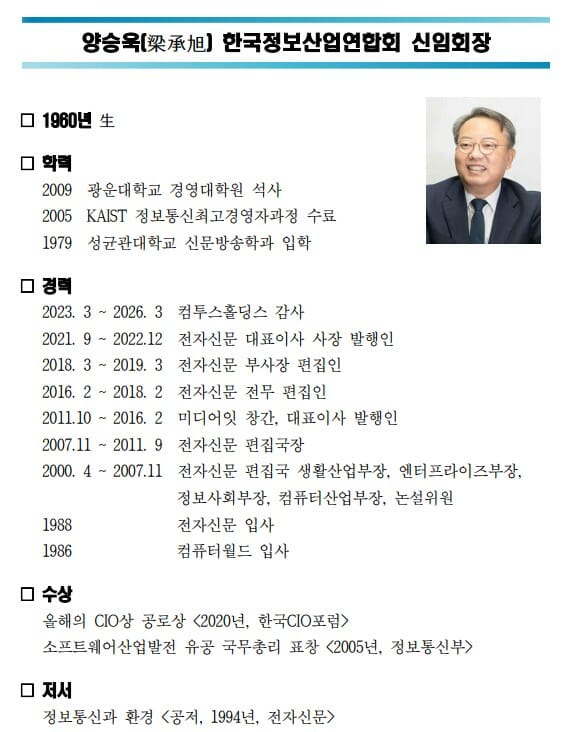 한국정보산업연합회(이하 정산연)는 양승욱 전 전자신문 대표를 제20대 회장으로 선임했다고 13일 밝혔다.