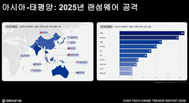 이밖에 그룹아이비에 따르면, 아시아태평양 국가중 작년 한해 랜섬웨어 그룹 공격을 가장 많이 받은 지역은 인도가 138건으로 가장 높았다. 인도에 이어 호주(132건), 일본(69건), 태국(63건), 싱가포르(59건), 한국(58건), 대만(57건), 말레이시아(46건), 인도네시아(35건), 중국(30건) 순으로 랜섬웨어 공격을 받았다.