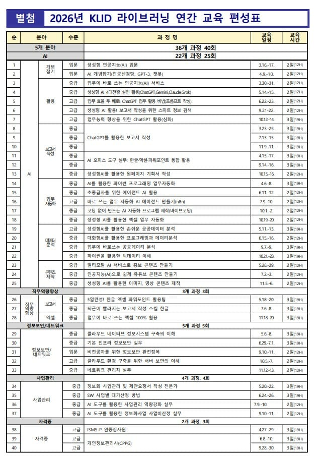첫 강좌는 16일 개강했다. 교육 신청은 KLID 아카데미 공식 누리집(www.klidacademy.or.kr)을 통해 과정별 교육 시작 2주 전까지 접수할 수 있다.