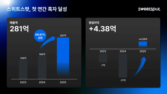 스위트스팟(대표 김정수)이 2025년 매출 281억원을 기록하며 설립 이후 처음으로 연간 흑자 전환에 성공했다고 17일 밝혔다.