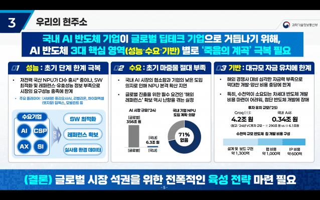 박태완 정보통신산업정책관은 "AI 반도체 시장의 패러다임이 범용성에서 효율성으로 옮겨가고 있다"며 "국내 기술 혁신이 성과로 연결되려면 대규모 자본 투입이 필수적이며 이를 위해 국민성장펀드와의 연계를 통한 집중 투자가 뒷받침돼야 한다"고 말했다.