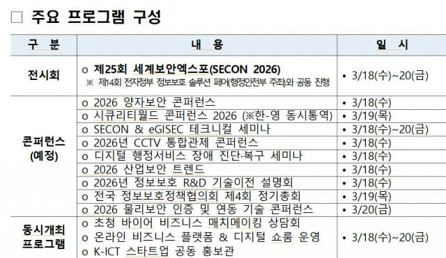 과학기술정보통신부는 '제25회 세계보안엑스포(SECON 2026)'를 18일부터 20일까지 일산 킨텍스 제1전시장에서 개최한다고 밝혔다.