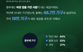 최근 5년 중 가장 높은 인상률을 기록하면서 종부세 대상 가구도 작년 31.8만 가구에서 올해 48.7만 가구로 53%나 늘었답니다. 특히 새롭게 종부세를 내야 하는 가구만 16만 가구에 달해요.