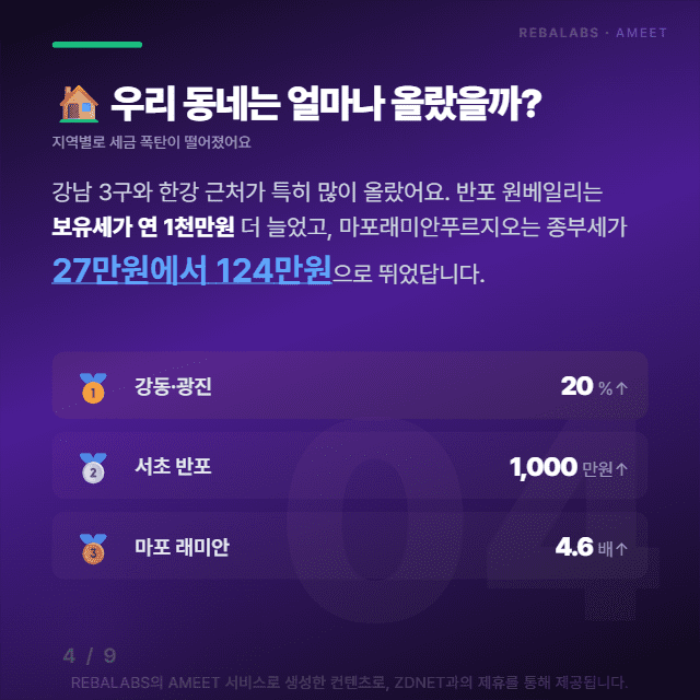 지역별로 보면 강남 3구와 한강변 일대가 특히 큰 타격을 받았어요. 서초구 반포 원베일리는 보유세만 연 1천만 원이 더 늘었고, 마포 래미안푸르지오는 종부세가 27만 원에서 124만 원으로 4.6배나 뛰었거든요. 강동과 광진 지역도 20% 넘게 오르면서 '우리 동네는 괜찮겠지' 했던 분들까지 당황하고 계신 상황이에요.