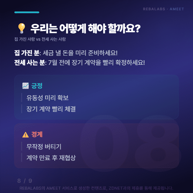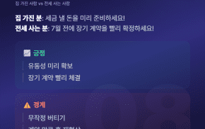 특히 7~9월 재산세 고지서가 나가는 시점부터 본격적으로 전세 시장이 요동칠 가능성이 높아요. 집을 가지고 계신 분들은 세금 낼 돈을 미리 준비하시고, 전세 사시는 분들은 7월 전에 장기 계약을 서둘러 확정하는 게 좋겠어요.
