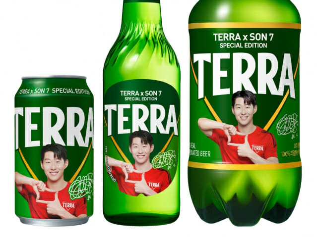 이런 상황에서 하이트진로는 테라 마케팅 강화로 반등을 노리고 있다. 이번에 선보이는 ‘테라 X SON7’ 스페셜 에디션은 테라의 삼각 로고와 금색 디자인은 유지하면서 손흥민 사진과 사인을 담은 게 특징이다. 손흥민의 ‘찰칵’ 골 세리머니를 전면에 내세웠고, 병뚜껑에는 축구공 이미지와 ‘SON’, ‘7’ 문구를 넣었다.