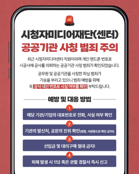 재단 관계자는 “모든 구매와 계약 절차는 입찰 공고 또는 공식 대표번호를 통해 이뤄진다”며 “조금이라도 의심스럽다면 즉시 해당 시청자미디어센터나 경찰서로 신고해 달라”고 당부했다.