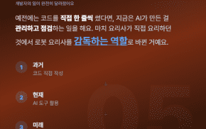 개발자의 역할 자체가 완전히 바뀐 거예요. 과거에 코드를 직접 한 줄씩 작성하던 요리사였다면, 지금은 로봇 요리사를 감독하는 역할로 전환됐고, 미래엔 더욱 관리자 역할이 중요해질 거예요.