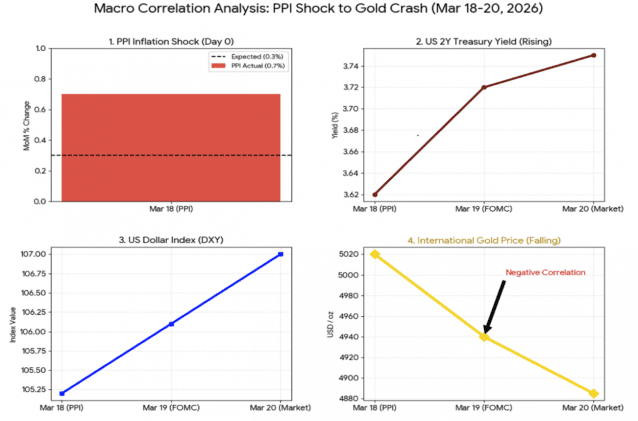 이 그래프는 3월 PPI & FOMC 발표 이후 인플레이션 충격이 어떻게 금리, 달러를 거쳐 금값의 폭락으로 이어졌는지 그 '역의 상관관계(Negative Correlation)'를 데이터로 입증했다.