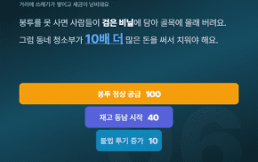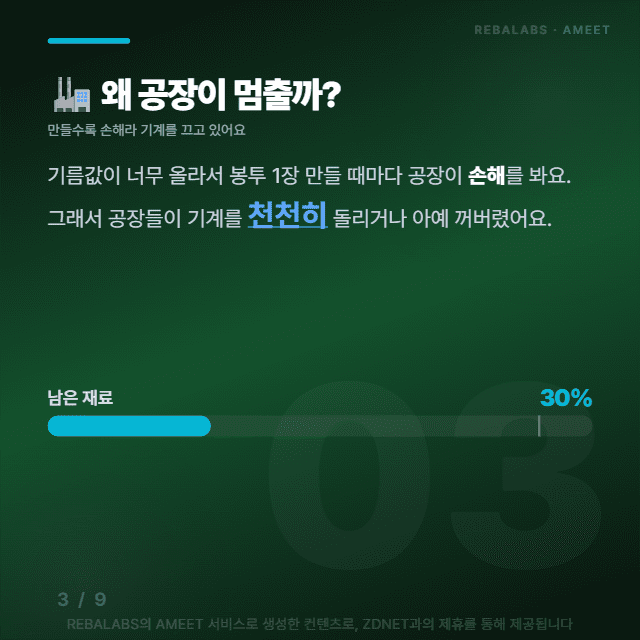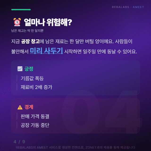 쓰레기봉투가 기름으로 만들어지다 보니, 지금은 봉투 한 장 만들 때마다 공장이 손해를 보고 있거든요. 그래서 공장들이 기계를 천천히 돌리거나 아예 꺼버린 상태예요. 창고에 남은 재료는 딱 한 달치뿐이고, 사람들이 불안해서 미리 사재기라도 시작하면 일주일 만에 동날 수도 있는 위험한 상황이에요.