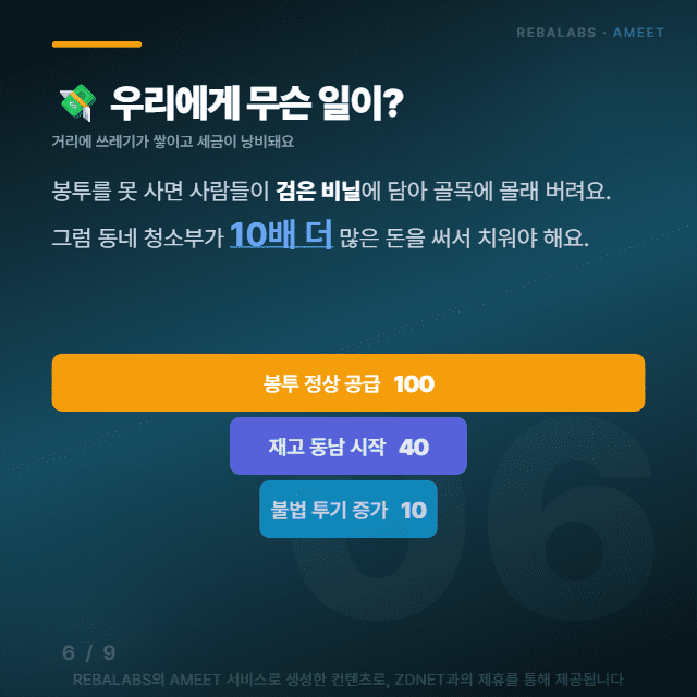 만약 봉투가 없어지면 어떻게 될까요? 사람들이 검은 비닐에 쓰레기를 담아 골목에 몰래 버리게 되고, 그럼 동네에서 10배 더 많은 세금을 써서 치워야 해요.