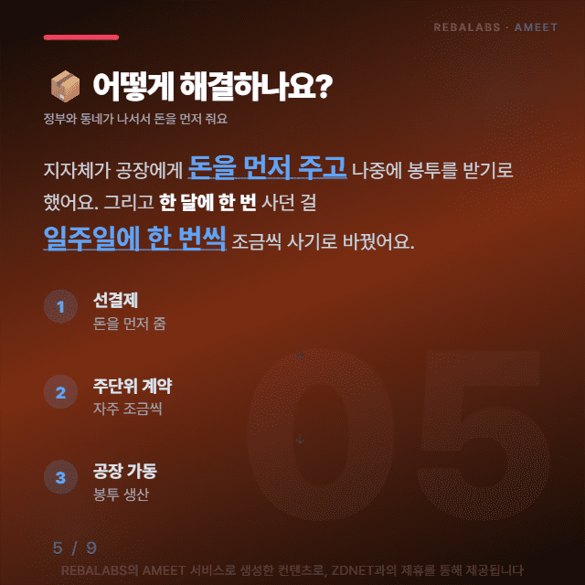정부와 지자체가 나서서 공장에 돈을 먼저 주고 나중에 봉투를 받는 '선결제' 방식으로 전환했어요. 한 달에 한 번 대량 구매하던 걸 일주일마다 조금씩 사는 방식으로 바꿔서 공장 가동률을 유지하려는 거죠.