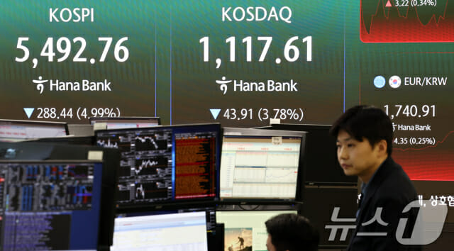 23일 오전 10시 24분 기준 코스피 지수는 전 거래일 대비 5.06% 하락한 5486.20으로 거래되고 있다.