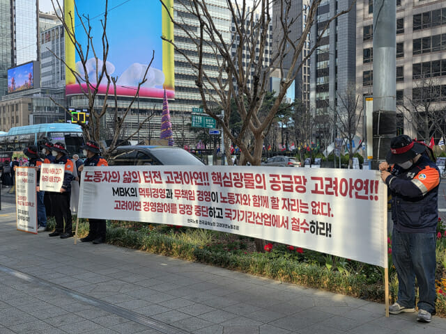노조는 ‘국가기간산업에서 철수하라’, ‘홈플러스를 망친 MBK에게 국가기간산업을 맡기시겠습니까’, ‘국민연금기금에 막대한 손해를 입힌 MBK 물러나라’ 등의 내용을 담은 피켓을 내세웠다.