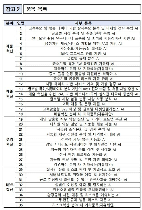 지원 분야는 제품 혁신, 매출 혁신, 경영 혁신, 리스크 혁신 등 4개 분야다. 수요자가 희망하는 품목을 지정해 신청할 수 있다. 또한, AI 기술 변화 속도와 다양한 기업 현장의 수요를 반영하기 위해 분야별로 자유제안도 가능하도록 했다.