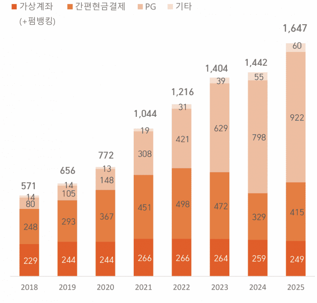 아직까지는 PG서비스 매출액 규모가 가장 큰 상황입니다. PG서비스 매출액은 2025년 922억원. ▲간편현금결제(415억원) ▲가상계좌+펌뱅킹(249억원) ▲기타 매출(60억원)으로 집계돼, 헥토파이낸셜의 태동을 알렸던 서비스인 가상계좌와 펌뱅킹 서비스에 대한 매출 비중은 점차 하락하는 것으로 조사됐습니다. 2025년에는 2024년 대비 매출이 가상계좌 부문은 3.6%, 펌뱅킹 부문은 6.3% 떨어졌습니다.