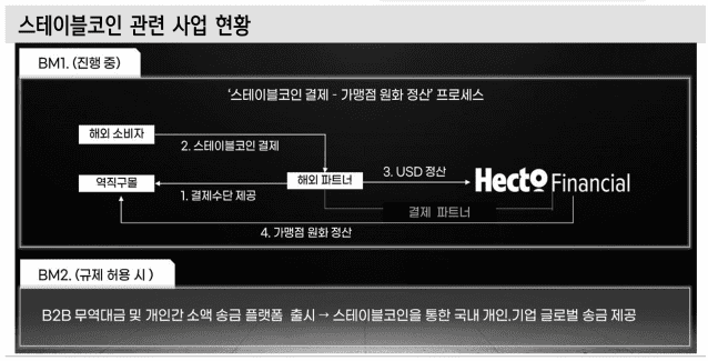 특히 글로벌 시장에 공을 들이고 있다는 점과 스테이블코인 정산을 대입해보면 헥토파이낸셜은 해외파트너와 결제 파트너를 맺고, 해외서 일어나는 결제에 관한 정산(원화 환전까지 포함)을 하겠다는 사업을 구상 중인 것으로 보입니다.