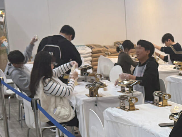 대한제분 부스에서는 직접 면을 뽑아보는 제면 체험이 진행됐다. 관람객은 반죽을 손으로 만진 뒤 밀가루를 묻히고, 기계에 넣어 면을 뽑아보는 방식으로 체험에 참여했다. 이 프로그램은 기호에 따라 소면과 칼국수 등의 종류로 만들 수 있도록 한 것이 특징이다.