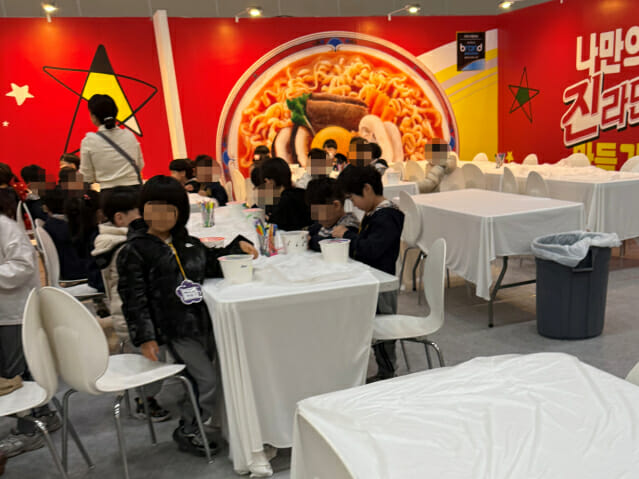 행사장 안으로 들어가자 라면 냄새가 먼저 났다. 곳곳에서는 라면을 끓이는 김이 올라왔고, 부스에 몰린 관람객들은 라면이 담긴 작은 종이컵을 손에 든 채 시식에 나섰다. 아이를 데리고 온 가족 관람객과 학생, 단체 관람객까지 뒤섞여 행사장은 북적였다.