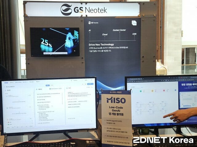 이날 GS네오텍은 전 산업군에 적용 가능한 핵심 솔루션으로 노코드·로우코드 기반 생성형 AI 플랫폼 미소도 선보였다. 미소는 기업 내부 데이터를 외부 대형언어모델(LLM)에 맡기지 않는 구조로 설계돼 보안을 강화한 것이 특징이다.