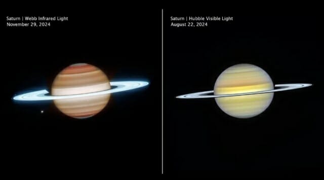 고리 구조에서도 차이가 뚜렷하다. 허블 관측에서는 얼음으로 이루어진 고리가 햇빛을 반사해 밝게 빛나며 선명한 구조를 드러내고, JWST 적외선 이미지에서는 어두운 우주 배경과 대비되며 고리의 세부 구조가 더욱 뚜렷하게 나타난다.