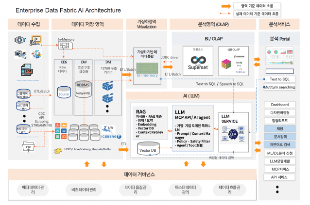 발표에서는 Data Fabric과 AI Governance를 결합한 엔터프라이즈 아키텍처가 소개됐다.메타데이터 기반 데이터 가상화, 데이터 품질 관리, 데이터 계보(Data Lineage), 비즈니스 메타데이터를 결합, AI가 신뢰 가능한 데이터만 활용하도록 설계하는 구조다.