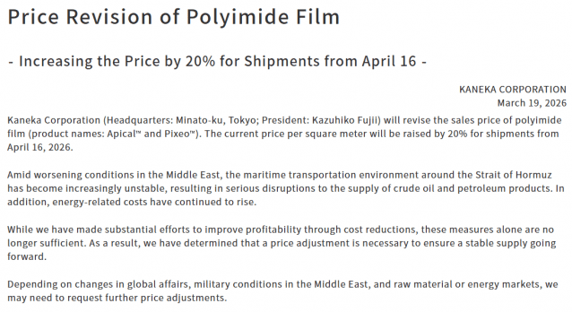 일본 카네카는 광학 아크릴 수지(HTX) 가격을 1kg당 30% 올리고, PI 필름 가격도 20% 인상한다고 발표했다. 다음달 16일 출하분부터 인상 가격을 적용한다. 옴디아가 자료에서 직접 언급하지 않았지만 PI 필름 1위 PI첨단소재도 가격을 올릴 것으로 예상된다.