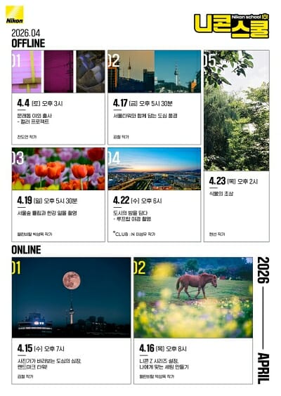 니콘이미징코리아가 오는 4월 진행할 일반 소비자 대상 교육 프로그램 '니콘스쿨'을 공개했다. 개화 시기에 맞춰 도심 속 다양한 풍경을 담을 수 있는 오프라인 강의를 대폭 강화했다.