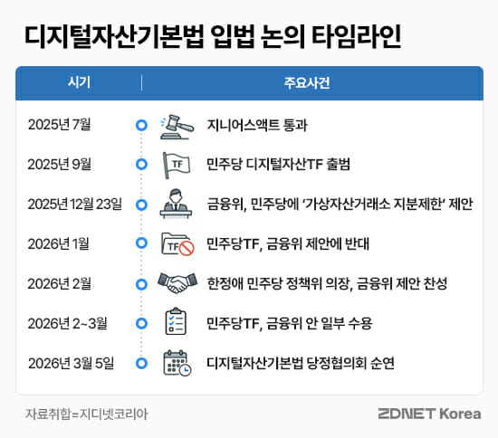 지난해 미국에서 스테이블코인 법안인 ‘지니어스 액트(Genius Act)’가 통과되면서, 국내에서도 가상자산 업권 법인 ‘디지털자산기본법’ 제정 필요성이 제기됐다. 이에 여당을 중심으로 지난해부터 제도화 논의가 본격화됐으나, 주요 쟁점을 둘러싼 당정과 업계 간 이견으로 논의가 멈춰선 상태다.