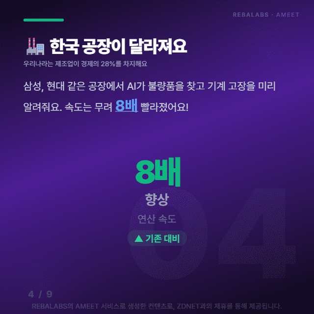 특히 우리나라처럼 제조업이 경제의 28%를 차지하는 나라에서는 삼성, 현대 같은 대기업 공장에서 AI가 불량품을 찾고 기계 고장을 미리 예측하면서 작업 속도가 무려 8배나 빨라졌어요.