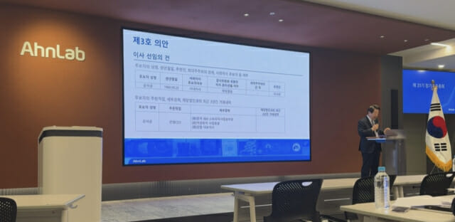 한편 강 대표는 이날 주주총회 인사말을 통해 "지난해 안랩은 글로벌 사업 확장을 통해 글로벌 통합 보안 기업으로 자리를 잡았으며, 다양한 솔루션과 서비스 영역에서 고른 성장을 이뤄냈다"며 "그 결과 전년 동기 대비 매출과 영업이익이 모두 증가하는 성과를 달성했다. 안랩은 빠르게 변화하는 인공지능(AI) 대전환 시대와 고객의 요구에 선제적으로 대응하고 중장기 미래를 준비하기 위해 '액셀러레이트 안랩'이라는 경영 방침 아래 AI 주요 제품과 서비스, 업무 방식의 변화를 계속해 나갈 계획"이라고 밝혔다.