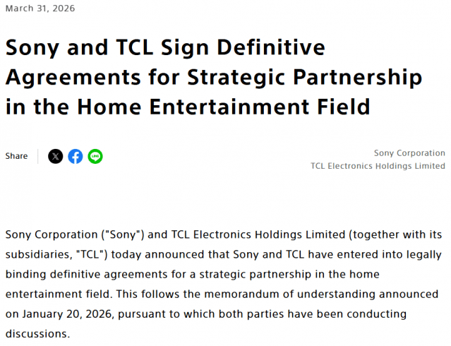 31일 TCL과 소니는 홈 엔터테인먼트 분야 전략 파트너십을 위한 법적 구속력 있는 최종계약을 체결했다고 발표했다. 합작사 지분율은 지난 1월 발표대로 TCL 51%, 소니 49% 등이다.
