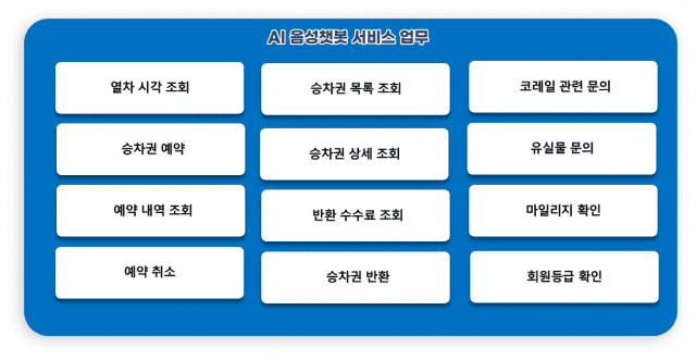1일 회사에 따르면, 코레일 AI음성챗봇은 콜센터 대표번호(1544-7788) 및 코레일 톡(시각, 지체 장애인 회원 대상)을 통해 이용할 수 있다. 월 14만건의 고객 문의를 처리한다. 기존 음성 챗봇은 열차 예약을 처리할 때 승차일자, 시간, 출발~도착역명, 인원수 등을 순차적으로 입력하는 시나리오 기반의 방식을 사용해왔는데, 이번에 고객이 자유롭게 대화하는 내용에서 열차 예매에 필요한 정보를 추출하고, 부족한 정보만 추가적으로 확인하는 방식으로 고도화했다.