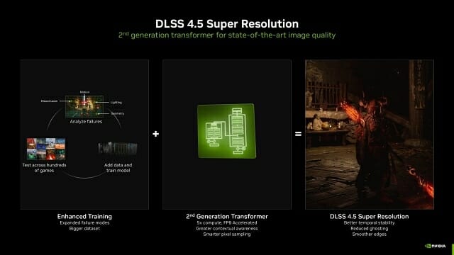 이날 공개된 DLSS 4.5 최신 버전은 지포스 RTX 50 시리즈 그래픽카드 장착 PC에서 초당 프레임을 최대 6배까지 높인다.