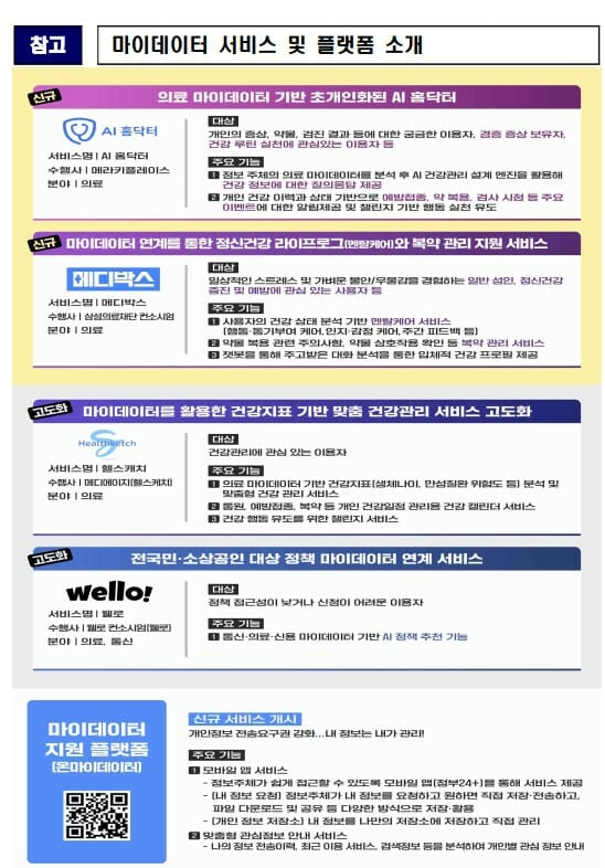 개인정보위는 그간 국민이 자신의 데이터를 스스로 통제하고, 원하는 곳으로 안전하게 전송·활용할 수 있도록 마이데이터 제도와 인프라를 지속적으로 구축해 왔다. 특히, 2024년부터 추진한 마이데이터 서비스 지원사업을 통해 국민이 체감할 수 있는 다양한 서비스 발굴을 지원해 왔으며, 이번 시연회에서는 2025년 지원사업에 참여한 주요 서비스 4종을 공개했다.