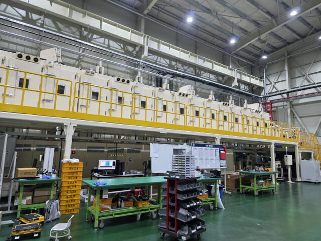 (대구=김윤희 기자) 공장 건물 입구부터 시작된 대형 설비는 100m 폭으로, 전체 내부 공간을 가로지를 만큼 거대했다. 배터리 핵심 소재인 음극 제조에 필요한 ‘코터’다. 함께 설치된 롤프레스, 슬리터 등 장비들까지 합하면 공장 내부 면적 중 절반을 채웠다.