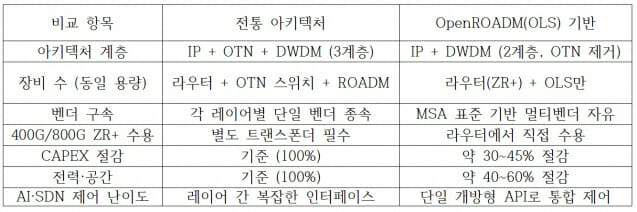 OpenROADM 기반 OLS 위에서는 라우터가 직접 800G ZR+ 모듈을 수용하고, OLS가 이를 수동으로 통과시킵니다. 추가 장비 없이 전송 용량을 확장합니다. OFC 2026이 CPO·LPO와 함께 개방형 광 표준의 중요성을 강조한 이유가 여기 있습니다.