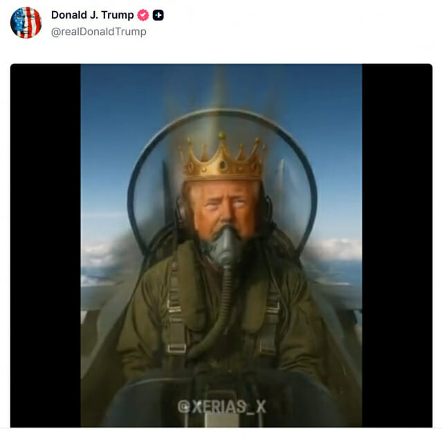 대표적인 인물이 도널드 트럼프 미국 대통령이다. 그는 자신이 만든 SNS ‘트루스 소셜’을 통해 다양한 AI 생성 이미지를 게시해 왔다. 왕관을 쓴 채 제트기를 조종하는 모습, 검을 뽑아 든 자신의 앞에 민주당 지도부들이 무릎을 꿇고 있는 모습 등이 대표적이다. 보고에 따르면 2024년 10월 기준으로 이미 36건의 AI 생성 콘텐츠를 올린 바 있으며, 취임 이후에도 이런 기조를 유지하고 있다.
