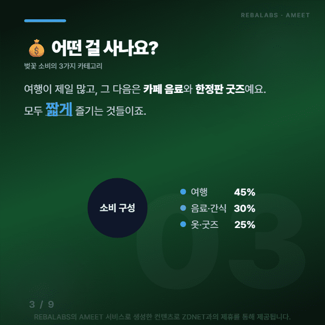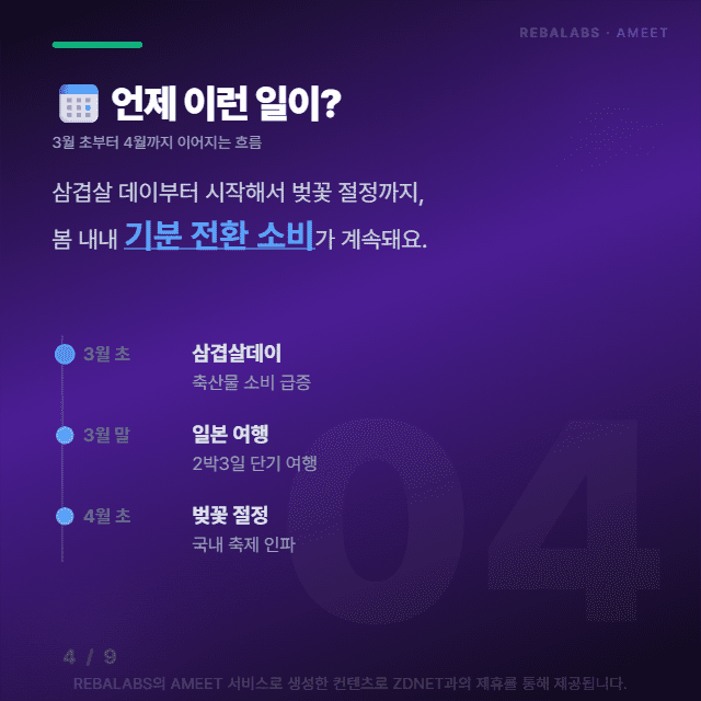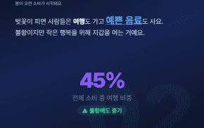 사람들은 여행을 떠나고, 카페에서 예쁜 음료를 사고, 한정판 굿즈도 구매하는데요. 여행이 전체의 45%로 가장 많고, 음료나 간식이 30%, 옷이나 굿즈가 25% 정도를 차지한다고 해요. 3월 초 삼겹살 데이부터 시작해서 4월 벚꽃 절정까지, 봄 내내 이런 기분 전환 소비가 이어지는 거죠.