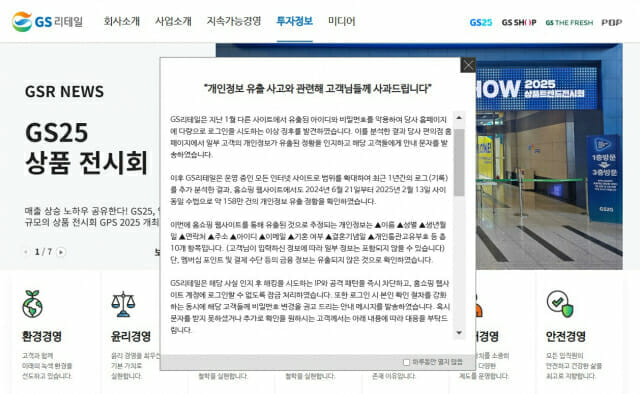 당시 공격으로 약 9만명의 고객 정보가 유출된 것으로 GS리테일은 추정했다. 이름, 성별, 생년월일, 연락처, 주소, 아이디, 이메일 등 개인정보가 유출된 정황이 포착된 것이다. 이후 GS리테일은 운영 중인 사이트를 모두 조사했다. 그 결과 GS샵에서도 2024년 6월21일부터 지난해 2월13일 사이 약 158만건의 개인정보 유출 정황을 확인했다.