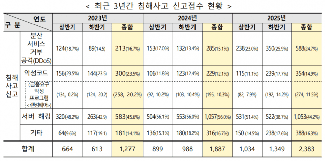 이 외에도 인하대, 아시아나항공 등 비교적 규모가 작은 침해사고도 잇따랐다. 과기정통부에 따르면 지난해 침해사고 신고 건수는 2383건으로 전년 대비 26.3% 증가했다.