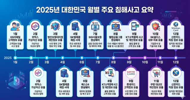 2025년의 주요 침해사고 사례를 보면, 수십년간 쌓아온 IT강국이라는 인식에 대한 신뢰가 완전히 무너졌음을 알 수 있다. 5월을 제외하고 매달 굵직한 침해사고가 터졌다.