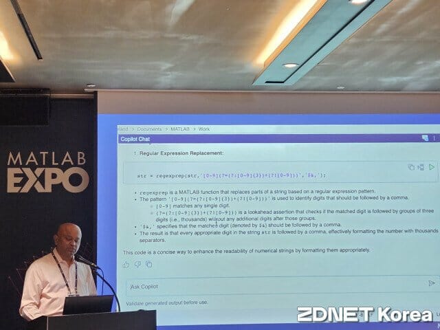 매스웍스는 이 같은 설계 가속화 흐름에 맞춰 자사 주력 제품군 전반에 생성형 AI를 단계적으로 내장하는 전략을 취하고 있다. 지난해 출시된 매트랩 코파일럿은 자연어로 코드 설명을 요청하거나 테스트 케이스를 자동 생성하는 등 반복적인 코딩 부담을 줄이는 데 초점을 맞춘 AI 어시스턴트다. 전체 소프트웨어 작업 시간의 35%가 코드를 이해하는 데 소요된다는 점에서 AI가 코드 파악과 초안 생성을 맡고 엔지니어는 의사결정에 집중하는 구조를 지향한다.