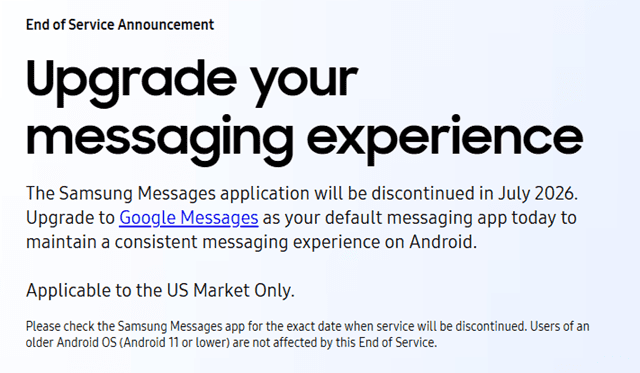 삼성은 7월에 서비스가 공식적으로 종료된 후엔 모든 기기에서 삼성 메시지 앱을 더 이상 이용할 수 없게 될 것이라고 밝혔다. 자체 메시지 앱 종료 결정은 미국 내 방침으로, 미국 외 지역에서 서비스 종료 지침을 적용할지는 확정되지 않았다.